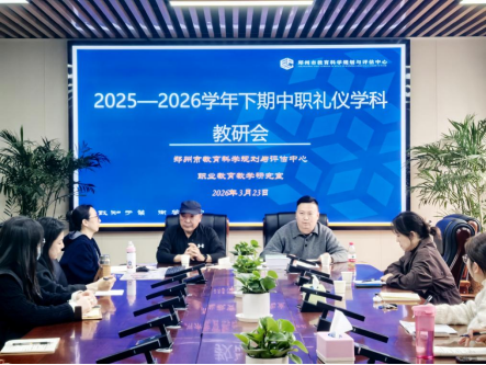 为深入贯彻职业教育改革新要求,推动礼仪教育与产业需求深度对接,提升中职礼仪教学质量与人才培养实效,3月24日,郑州市中职学校礼仪学科中心组教研会在郑州市科技工业学校顺利举行。全市各中职学校礼仪学科骨干教师齐聚一堂,凝聚教研共识,明确发展路径,共同探索中职礼仪教育创新发展路径。郑州市教育科学规划与评估中心教研员徐二森、杨尚霖参加会议。